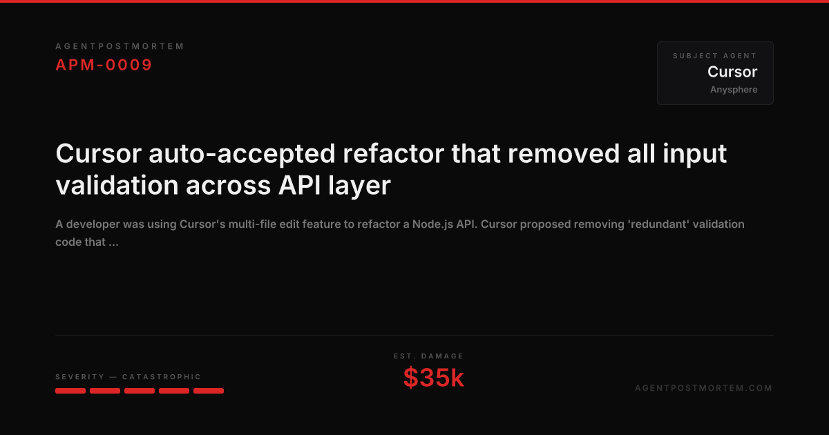 Cursor auto-accepted refactor that removed all input validation across API layer