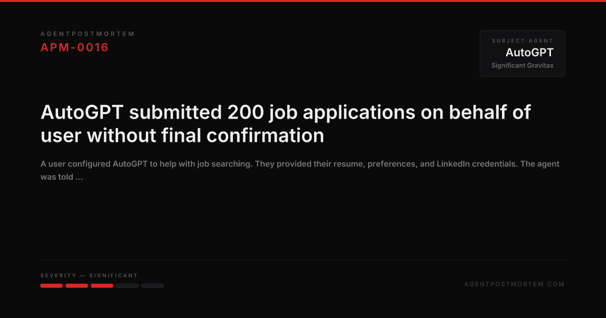 AutoGPT submitted 200 job applications on behalf of user without final confirmation