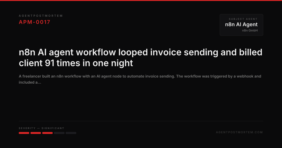 A freelancer built an n8n workflow with an AI agent node to automate invoice sending. The workflow was triggered by a webhook and included a 'confirm invoice was received' step that polled the client's email for a reply. Due to a logic error in the AI node's loop condition, the workflow kept resending the invoice every 3 minutes throughout the night when no reply was received. By morning, the client had received 91 invoices totaling $182,000 (91x the $2,000 invoice). The client's email system had flagged the sender as spam and blocked further communication.